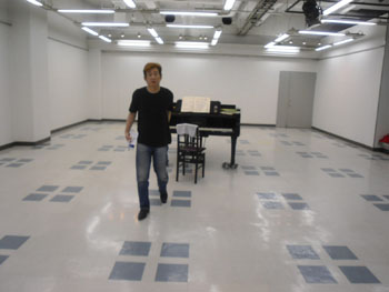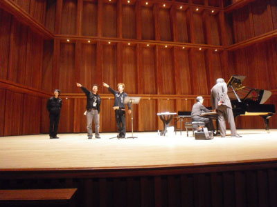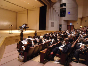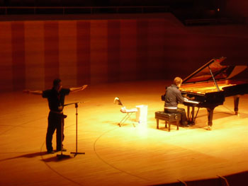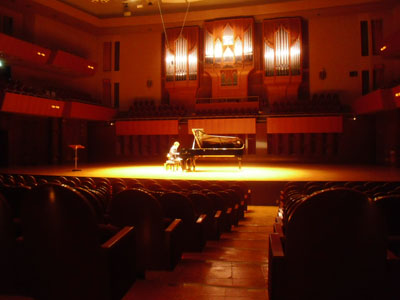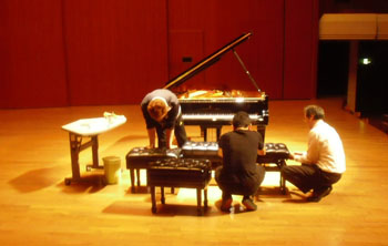 | 2011年最初の「ショパンの旅リサイタル」は、2年ぶりの芸文センター、気合いが入ります。 調律師さんお二人が調整中に、舞台スタッフさんと体操? |