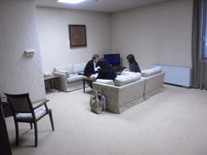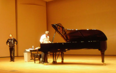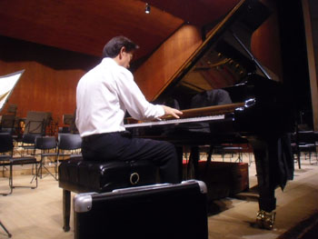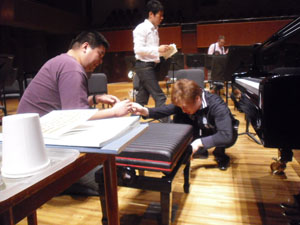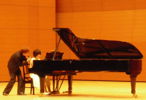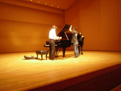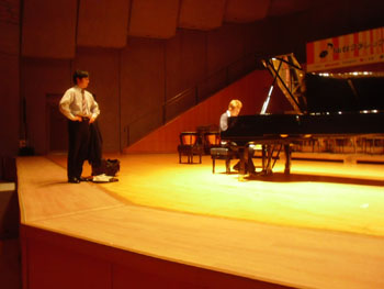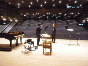 | まずは青年文化センターでのリサイタル、調律師さんが見守る中、 短時間のリハーサル中 |