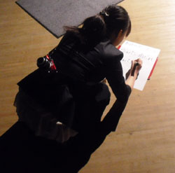 ![]() アンコールの曲目書き出し、 なんとこの日はショパン「雨だれ」! 舞台袖に座り込む三井住友海上文化財団の早川さん |