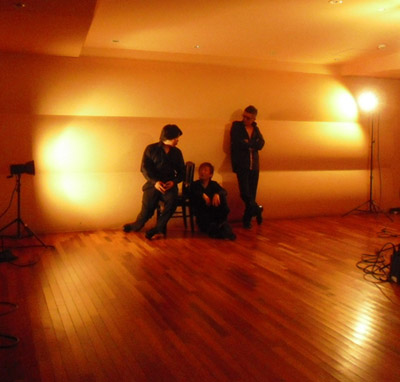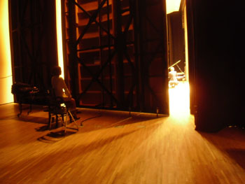 | リハーサル開始、同時に照明をつくって頂きます。 | 本番前、誰もみていないところでピアノ位置をちょっと変えている川真田名人を発見。及川も気付いていません・・・。 |