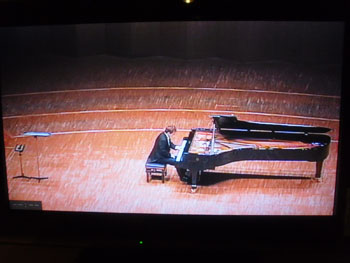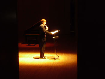 | 本番中に袖から盗み撮り。そう、今回のリスト・ツアーは朗読入りです! ちなみに今日のアンコールは3曲、その3曲目はもちろん、ショパンのノクターン16番でした。 (なぜ「もちろん」なのかわからない方は去年12月10日のASHIATOをご参照下さい!) |