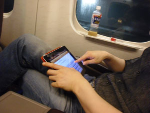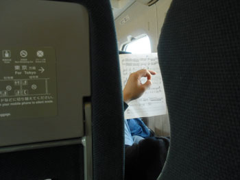 | 前日8日にリハーサル、名古屋に向かう車中で楽譜を開く及川 | |