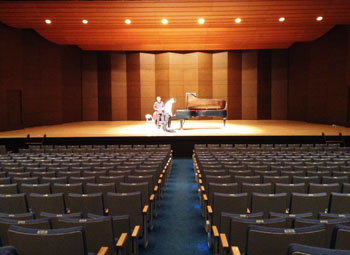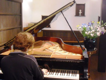 | 翌日早朝から調律の平田さん、毎年ありがとうございます | 本番前のリハーサル、正面からベートーヴェンの胸像が見守ってくれています! |