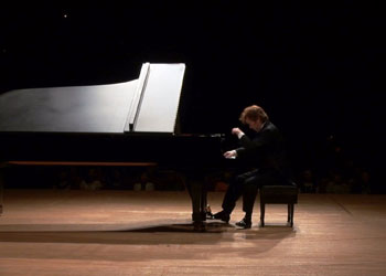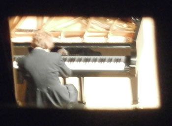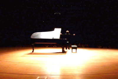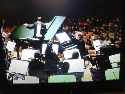 | オペラシティで演奏するのはBee以来でしょうか | 演奏中のモニター画面、現代曲といえども及川浩治のピアノは熱い! |