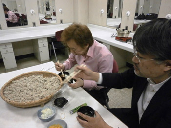 | たまにはこんなアングルで演奏写真を | 終演後、館長さんのお父上手打ちのお蕎麦を貪る及川と調律の平山さん |