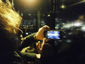 | ロープウェイの中から夜景の写真を撮る及川浩治 | 写真では伝わりませんけど、港の夜景はこんな感じ |