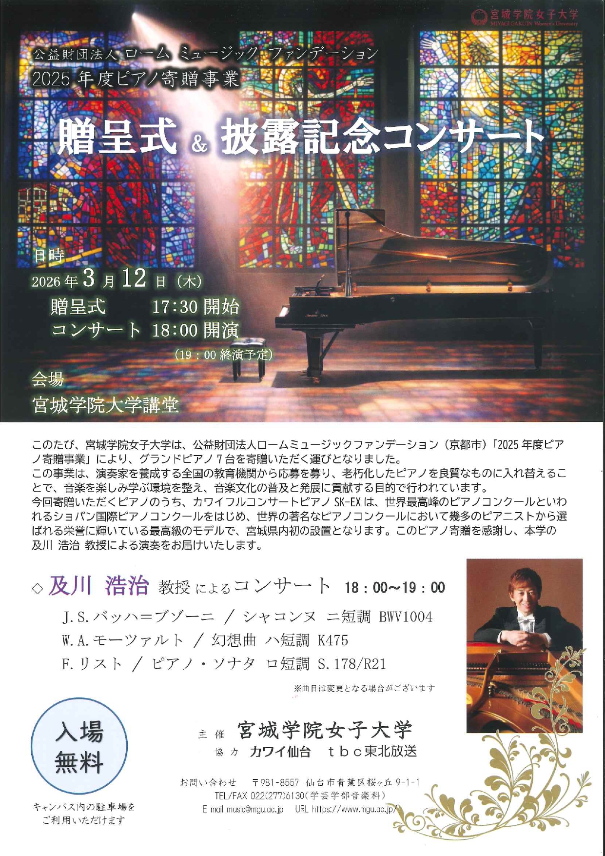 | お問合せ・料金 | 宮城学院女子大学 音楽科 022-277-6130 入場無料 |