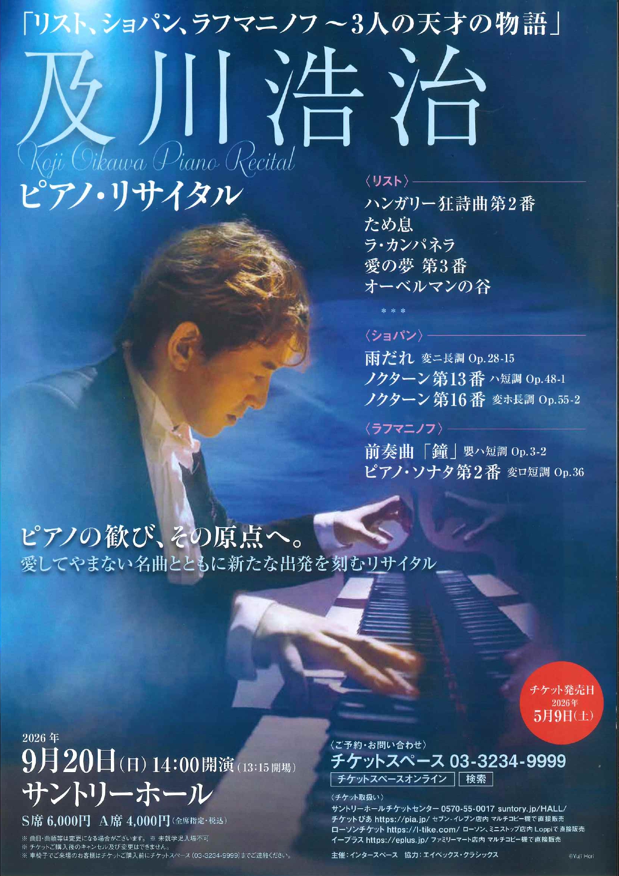 9/20(日) 14:00 | [東京] サントリーホール | 及川浩治ピアノ・リサイタル「リスト、ショパン、ラフマニノフ~3人の天才の物語」 リスト:ハンガリー狂詩曲第2番 リスト:ため息 リスト:ラ・カンパネラ リスト:愛の夢 第3番 リスト:オーベルマンの谷 ショパン:雨だれ ショパン:ノクターン第13番 ショパンノクターン第16番 ラフマニノフ:前奏曲「鐘」 ラフマニノフ:ピアノ・ソナタ第2番 | チケットスペース 03-3234-9999 S席6,000円 A席4,000円 ※発売日: 5/9(土) | |