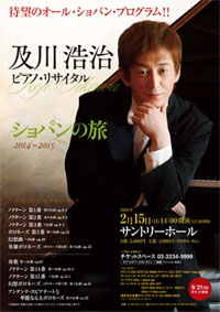 及川浩治ピアノ・リサイタル 「ショパンの旅2014〜2015」 <オール・ショパン・プログラム> ノクターン第1番、第2番、第3番 ポロネーズ第5番 幻想曲 英雄ポロネーズ 舟歌 ノクターン第14番、第15番 幻想ポロネーズ アンダンテ・スピアナートと華麗なる大ポロネーズ ![]() |