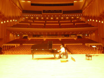 | 2011年最初の「ショパンの旅リサイタル」は、2年ぶりの芸文センター、気合いが入ります。 調律師さんお二人が調整中に、舞台スタッフさんと体操? |