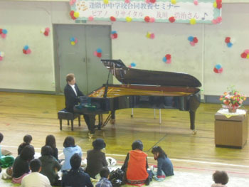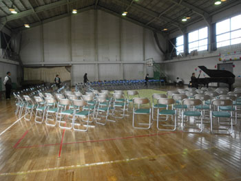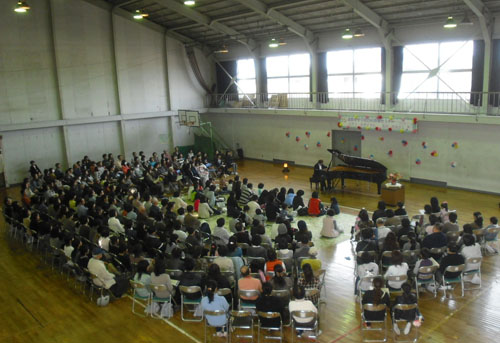 津波被害の大きかった宮古市、前夜宿泊したホテルも1階は完全に浸水し、宮古市の文化会館もまだ全く復旧の目途がたっていないのだそうです。その文化会館の舞台上で脚まで水に浸かったスタインウェイが、この新里中学校に避難しています。今回はそのピアノを使用して演奏しました。