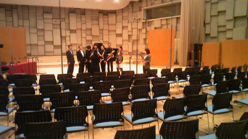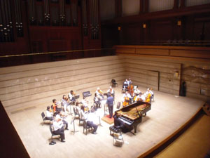 | 当日のゲネプロ風景。きれいなホールですね。 ご覧の通りショパンのコンチェルトは「室内楽版」です! |