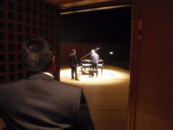 | 若い頃に何度も上がった小ホール、久々です! | ステマネさんが見守る中、調律の久連松さんに何かをお願いする及川 バッハ〜モーツァルト〜ベートーヴェン〜シューベルト〜リスト。 小ホールならではとも言えるコアな曲目ですが、演奏者もお客様も充実感たっぷりな演奏会だったのではないでしょうか。 |