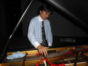 | 調律は今年も東京から平山さんに来て頂きました 「確か去年はリハーサルで弦を切っちゃったよね・・・」 |