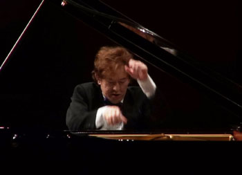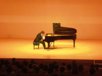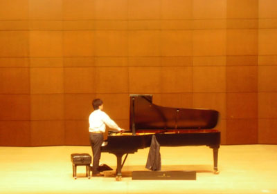 | オペラシティで演奏するのはBee以来でしょうか | 演奏中のモニター画面、現代曲といえども及川浩治のピアノは熱い! |