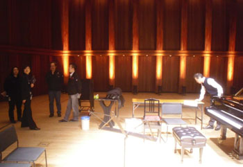 | 「照明どうしようか?」とスタッフの皆さん相談中、 右は調律の久連松さん |