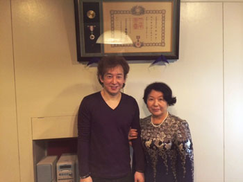 及川がまだ無名の頃からの恩人・青嶋節子さんと勲章の前で記念撮影 |