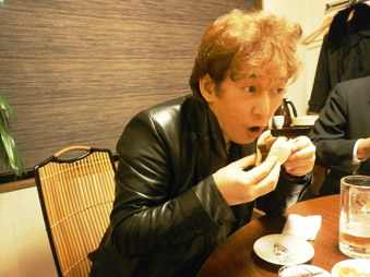 | 本番中、ピアノはかなり前に配置しました | 打ち上げはやっぱり中華、角煮まんじゅうを一口かじり「うっめー!」 |