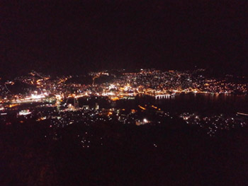 | ロープウェイの中から夜景の写真を撮る及川浩治 | 写真では伝わりませんけど、港の夜景はこんな感じ |