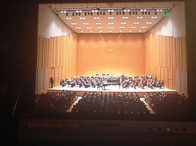 | アンコール中のテレビモニター、「雨だれ」を弾く及川浩治と見守るマエストロ |